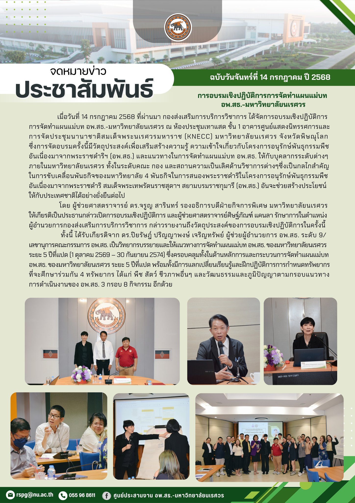 เมื่อวันที่ 14 กรกฎาคม 2568 ที่ผ่านมา กองส่งเสริมการบริการวิชาการ ได้จัดการอบรมเชิงปฏิบัติการการจัดทำแผนแม่บท อพ.สธ.-มหาวิทยาลัยเรศวร ณ ห้องประชุมเทาแสด ชั้น 1 อาคารศูนย์แสดงนิทรรศการและการจัดประชุมนานาชาติสมเด็จพระนเรศวรมหาราช (KNECC) มหาวิทยาลัยนเรศวร จังหวัดพิษณุโลก ซึ่งการจัดอบรมครั้งนี้มีวัตถุประสงค์เพื่อเสริมสร้างความรู้ ความเข้าใจเกี่ยวกับโครงการอนุรักษ์พันธุกรรมพืช อันเนื่องมาจากพระราชดำริฯ (อพ.สธ.) และแนวทางในการจัดทำแผนแม่บท อพ.สธ. ให้กับบุคลากรระดับต่างๆ ภายในมหาวิทยาลัยนเรศวร ทั้งในระดับคณะ กอง และสถานความเป็นเลิศด้านวิชาการต่างๆซึ่งเป็นกลไกสำคัญในการขับเคลื่อนพันธกิจของมหาวิทยาลัย 4 พันธกิจในการสนองพระราชดำริในโครงการอนุรักษ์พันธุกรรมพืชอันเนื่องมาจากพระราชดำริ สมเด็จพระเทพรัตนราชสุดาฯ สยามบรมราชกุมารี (อพ.สธ.) อันจะช่วยสร้างประโยชน์ให้กับประเทศชาติได้อย่างยั่งยืนต่อไป โดย ผู้ช่วยศาสตราจารย์ ดร.จรูญ สารินทร์ รองอธิการบดีฝ่ายกิจการพิเศษ มหาวิทยาลัยนเรศวร ให้เกียรติเป็นประธานกล่าวเปิดการอบรมเชิงปฏิบัติการ และผู้ช่วยศาสตราจารย์ศิษฐ์ภัณฑ์ แคนลา รักษาการในตำแหน่งผู้อำนวยการกองส่งเสริมการบริการวิชาการ กล่าวรายงานถึงวัตถุประสงค์ของการอบรมเชิงปฏิบัติการในครั้งนี้ ทั้งนี้ ได้รับเกียรติจาก ดร.ปิยรัษฎ์ ปริญญาพงษ์ เจริญทรัพย์ ผู้ช่วยผู้อำนวยการ อพ.สธ. ระดับ 9/เลขานุการคณะกรรมการ อพ.สธ. เป็นวิทยากรบรรยายและให้แนวทางการจัดทำแผนแม่บท อพ.สธ. ของมหาวิทยาลัยนเรศวร ระยะ 5 ปีที่แปด (1 ตุลาคม 2569 – 30 กันยายน 2574) ซึ่งครอบคลุมทั้งในด้านหลักการและกระบวนการจัดทำแผนแม่บท อพ.สธ. ของมหาวิทยาลัยนเรศวร ระยะ 5 ปีที่แปด พร้อมทั้งมีการแลกเปลี่ยนเรียนรู้และฝึกปฏิบัติการการกำหนดทรัพยากรที่จะศึกษาร่วมกัน 4 ทรัพยากร ได้แก่ พืช สัตว์ ชีวภาพอื่นๆ และวัฒนธรรมและภูมิปัญญา ตามกรอบแนวทางการดำเนินงานของ อพ.สธ. 3 กรอบ 8 กิจกรรม อีกด้วย |