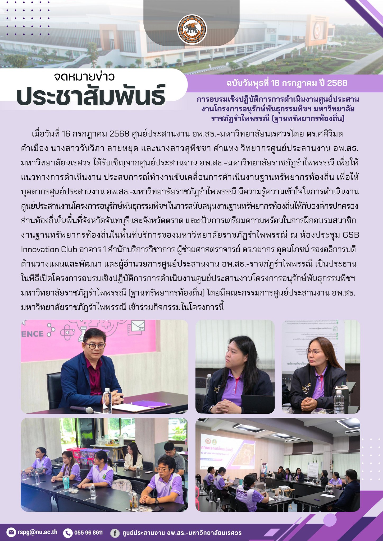 เมื่อวันที่ 16 กรกฎาคม 2568 ศูนย์ประสานงาน อพ.สธ.-มหาวิทยาลัยนเรศวรโดย ดร.ศศิวิมล คำเมือง นางสาววันวิภา สายหยุด และนางสาวสุพิชชา คำแหง วิทยากรศูนย์ประสานงาน อพ.สธ.-มหาวิทยาลัยนเรศวร ได้รับเชิญจากศูนย์ประสานงาน อพ.สธ.-มหาวิทยาลัยราชภัฏรำไพพรรณี เพื่อให้แนวทางการดำเนินงาน ประสบการณ์ทำงานขับเคลื่อนการดำเนินงานฐานทรัพยากรท้องถิ่น เพื่อให้บุคลากรศูนย์ประสานงาน อพ.สธ.-มหาวิทยาลัยราชภัฏรำไพพรรณี มีความรู้ความเข้าใจในการดำเนินงานศูนย์ประสานงานโครงการอนุรักษ์พันธุกรรมพืชฯ ในการสนับสนุนงานฐานทรัพยากรท้องถิ่นให้กับองค์กรปกครองส่วนท้องถิ่นในพื้นที่จังหวัดจันทบุรีและจังหวัดตราด และเป็นการเตรียมความพร้อมในการฝึกอบรมสมาชิกงานฐานทรัพยากรท้องถิ่นในพื้นที่บริการของมหาวิทยาลัยราชภัฏรำไพพรรณี ณ ห้องประชุม GSB Innovation Club อาคาร 1 สำนักบริการวิชาการ ผู้ช่วยศาสตราจารย์ ดร.วยากร อุดมโภชน์ รองอธิการบดี ด้านวางแผนและพัฒนา และผู้อำนวยการศูนย์ประสานงาน อพ.สธ.-ราชภัฏรำไพพรรณี เป็นประธานในพิธีเปิดโครงการอบรมเชิงปฏิบัติการการดำเนินงานศูนย์ประสานงานโครงการอนุรักษ์พันธุกรรมพืชฯ มหาวิทยาลัยราชภัฏรำไพพรรณี (ฐานทรัพยากรท้องถิ่น) โดยมีคณะกรรมการศูนย์ประสานงาน อพ.สธ.-มหาวิทยาลัยราชภัฏรำไพพรรณี เข้าร่วมกิจกรรมในโครงการนี้ |