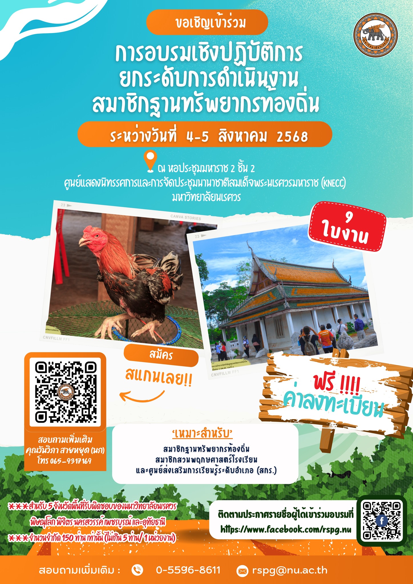 ศูนย์ประสานงาน อพ.สธ.-มหาวิทยาลัยนเรศวร ขอเชิญสมาชิกฐานทรัพยากรท้องถิ่น สมาชิกสวนพฤกษศาสตร์โรงเรียน และศูนย์ส่งเสริมการเรียนรู้ระดับอำเภอ (สกร.)สำหรับ 5 จังหวัดพื้นที่รับผิดชอบของมหาวิทยาลัยนเรศวร : พิษณุโลก พิจิตร นครสวรรค์ เพชรบูรณ์ และอุทัยธานี การอบรมเชิงปฏิบัติการยกระดับการดำเนินงานสมาชิกฐานทรัพยากรท้องถิ่น ในวันที่ 4-5 สิงหาคม พ.ศ.2568 เวลา 08.30 - 16.30 น.ณ ห้องประชุมมหาราช 2 ชั้น 2 อาคารศูนย์แสดงนิทรรศการและการจัดประชุมนานาชาติสมเด็จพระนเรศวรมหาราช มหาวิทยาลัยนเรศวร วันปิดรับลงทะเบียน 25 กรกฎาคม พ.ศ.2568 เวลา 18.00 น. หรือจนกว่าจะเต็มจำนวน |