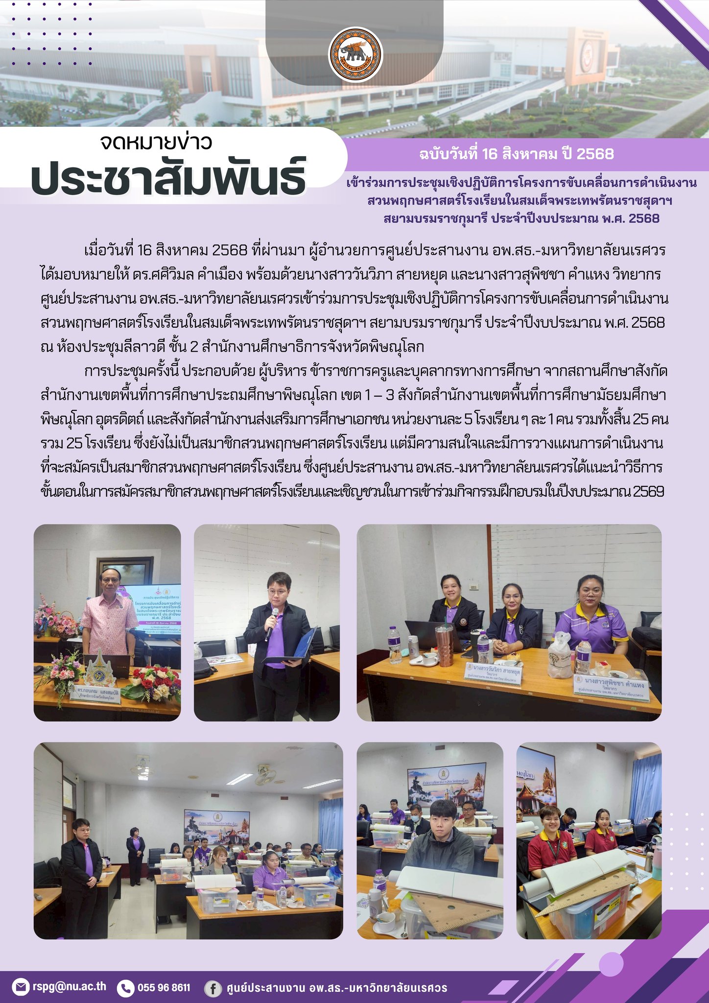 เมื่อวันที่ 16 สิงหาคม 2568 ที่ผ่านมา ผู้อำนวยการศูนย์ประสานงาน อพ.สธ.-มหาวิทยาลัยนเรศวร ได้มอบหมายให้ ดร.ศศิวิมล คำเมือง พร้อมด้วยนางสาววันวิภา สายหยุด และนางสาวสุพิชชา คำแหง วิทยากรศูนย์ประสานงาน อพ.สธ.-มหาวิทยาลัยนเรศวรเข้าร่วมการประชุมเชิงปฏิบัติการโครงการขับเคลื่อนการดำเนินงานสวนพฤกษศาสตร์โรงเรียนในสมเด็จพระเทพรัตนราชสุดาฯ สยามบรมราชกุมารี ประจำปีงบประมาณ พ.ศ. 2568 ณ ห้องประชุมลีลาวดี ชั้น 2 สำนักงานศึกษาธิการจังหวัดพิษณุโลก การประชุมครั้งนี้ ประกอบด้วย ผู้บริหาร ข้าราชการครูและบุคลากรทางการศึกษา จากสถานศึกษาสังกัดสำนักงานเขตพื้นที่การศึกษาประถมศึกษาพิษณุโลก เขต 1 – 3 สังกัดสำนักงานเขตพื้นที่การศึกษามัธยมศึกษาพิษณุโลก อุตรดิตถ์ และสังกัดสำนักงานส่งเสริมการศึกษาเอกชน หน่วยงานละ 5 โรงเรียน ๆ ละ 1 คน รวมทั้งสิ้น 25 คน รวม 25 โรงเรียน ซึ่งยังไม่เป็นสมาชิกสวนพฤกษศาสตร์โรงเรียน แต่มีความสนใจและมีการวางแผนการดำเนินงานที่จะสมัครเป็นสมาชิกสวนพฤกษศาสตร์โรงเรียน ซึ่งศูนย์ประสานงาน อพ.สธ.-มหาวิทยาลัยนเรศวรได้แนะนำวิธีการขั้นตอนในการสมัครสมาชิกสวนพฤกษศาสตร์โรงเรียนและเชิญชวนในการเข้าร่วมกิจกรรมฝึกอบรมในปีงบประมาณ 2569 |