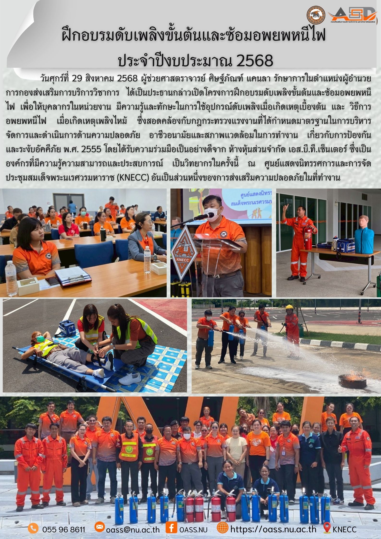 วันศุกร์ที่ 29 สิงหาคม 2568 ผู้ช่วยศาสตราจารย์ ศิษฐ์ภัณฑ์ แคนลา รักษาการในตำแหน่งผู้อำนวยการกองส่งเสริมการบริการวิชาการ ได้เป็นประธานกล่าวเปิดโครงการฝึกอบรมดับเพลิงขั้นต้นและซ้อมอพยพหนีไฟ เพื่อให้บุคลากรในหน่วยงาน มีความรู้และทักษะในการใช้อุปกรณ์ดับเพลิงเมื่อเกิดเหตุเบื้องต้น และ วิธีการอพยพหนีไฟ เมื่อเกิดเหตุเพลิงไหม้ ซึ่งสอดคล้องกับกฎกระทรวงแรงงานที่ได้กำหนดมาตรฐานในการบริหารจัดการและดำเนินการด้านความปลอดภัย อาชีวอนามัยและสภาพแวดล้อมในการทำงาน เกี่ยวกับการป้องกันและระงับอัคคีภัย พ.ศ. 2555 โดยได้รับความร่วมมือเป็นอย่างดีจาก ห้างหุ้นส่วนจำกัด เอส.บี.ที.เซ็นเตอร์ ซึ่งเป็นองค์กรที่มีความรู้ความสามารถและประสบการณ์ เป็นวิทยากรในครั้งนี้ ณ ศูนย์แสดงนิทรรศการและการจัดประชุมสมเด็จพระนเรศวรมหาราช (KNECC) อันเป็นส่วนหนึ่งของการส่งเสริมความปลอดภัยในที่ทำงาน |